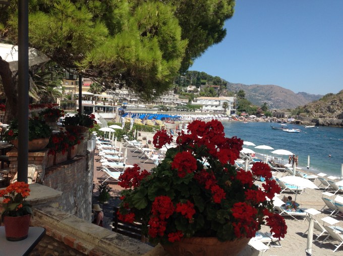 Taormina on the East coast of Sicily is the quintessential Italian beach town. It has bustling pedestrian only cobblestone streets welcoming visitors. The funicular glides down from town on the hill to the sea below. The hotels are glamorous, the beaches plentiful, the scenery awe inspiring. I love to check out beautiful hotel properties. One definitely worth a visit while at the beach is the Hotel Villa Sant’Andrea. Stop by for an aperitivo or cocktail on the terrace. Bask in the sunshine while sipping an Aperol Spritz. Soak in the glamour for the price of a cocktail. This is truly a Happy Hour..