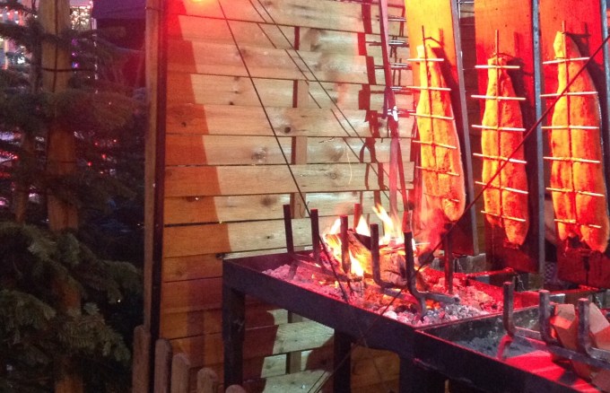 Some of the most delicious dinners in Zurich at Christmas are not in the restaurants but at all the various stands at the Christmas markets around town. One of the most memorable was at a Finnish stand selling flammlachs. Flamm means flame and lachs means salmon. They take large salmon halves and plank them over a big smoky wood fire. While cooking the salmon is sprinkled with salt water. The end result is unlike any salmon you have had. It is smoky moist and full of flavor. They serve it was a tangy yogurt sauce for dipping. Finish your night at the Baileys coffee stand. Take your warming coffee drink, watch the skaters, and just be silly with your friends. The Christmas spirit is so joyful in Switzerland.